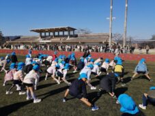 年長さんたちがマラソン大会をしました。通園バスに乗って夏見のメイハンフィールドに到着です。 体育講師の落合先生から説明をしてもらい、まずは準備運動です。ケガをしないように入念に体を動かします。